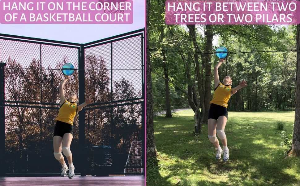 You can hang the elastic cord between two pillars or between two trees or on the corner of a basketball/volleyball court fence, as shown in the image above.