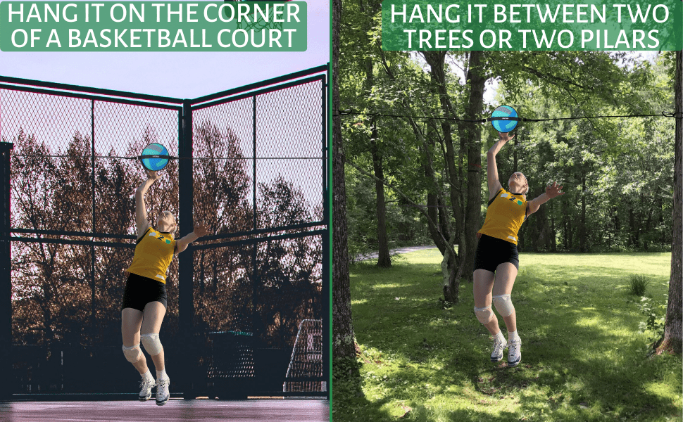 You can hang the elastic cord between two pillars or between two trees or on the corner of a basketball /volleyball court fence, as shown in the image above.